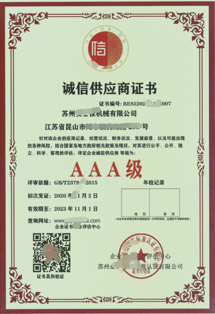 AAA诚信供应商证书